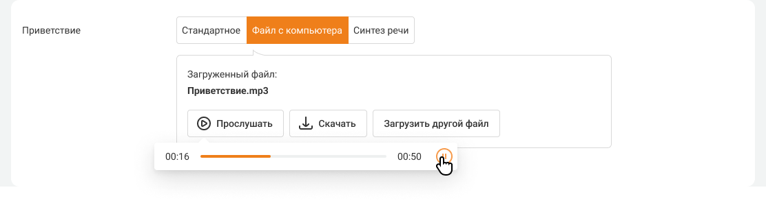 1. В настройках приветствия перейдите на вкладку «Файл с компьютера» и нажмите на кнопку «Загрузить файл».