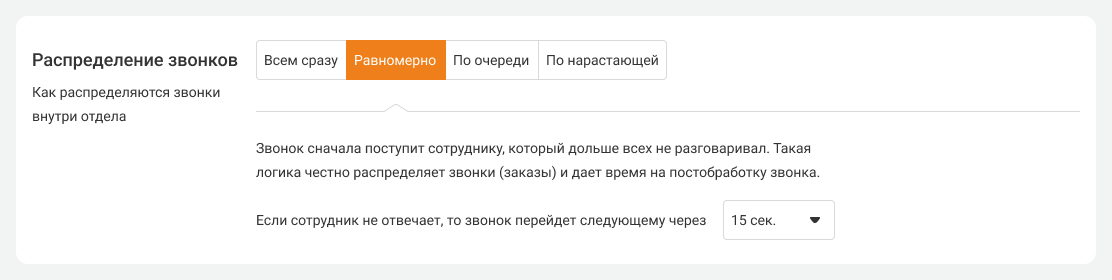 Равномерно Звонок сначала поступит сотруднику, который дольше всех не получал звонок. Так вы сможете организовать наиболее честное и равномерное распределение входящих звонков (заказов) между сотрудниками.