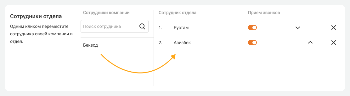 Далее в блоке «Сотрудники отдела» укажите, кому из менеджеров должны поступать звонки отдела.