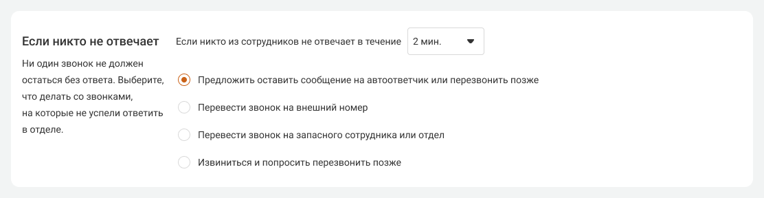Выберите порядок действий в случае, что когда сотрудники отдела не отвечают в течение определенного количества времени (длительность настраивается).