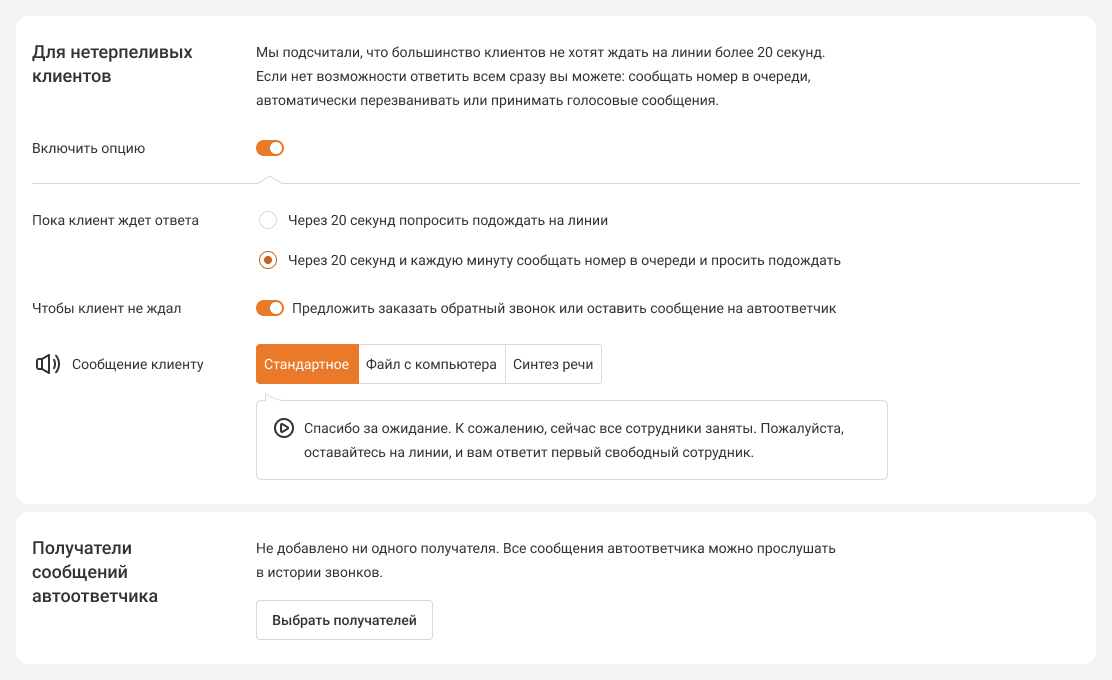 Чтобы не допустить этого, рекомендуем включить опцию «Для нетерпеливых клиентов», извиниться перед клиентом за ожидание и предложить заказать обратный звонок из очереди или голосовую почту на Автоответчик. Также вы можете сказать номер в очереди и предложить оставаться на линии.