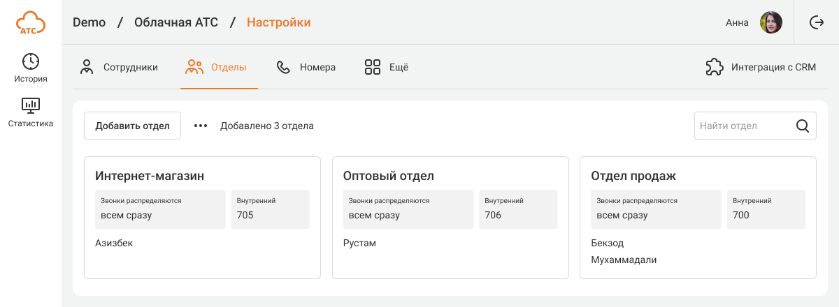 «Отдел продаж +998 (90) 123-45-67» - это название отдела, который вы создали в Облачной АТС.