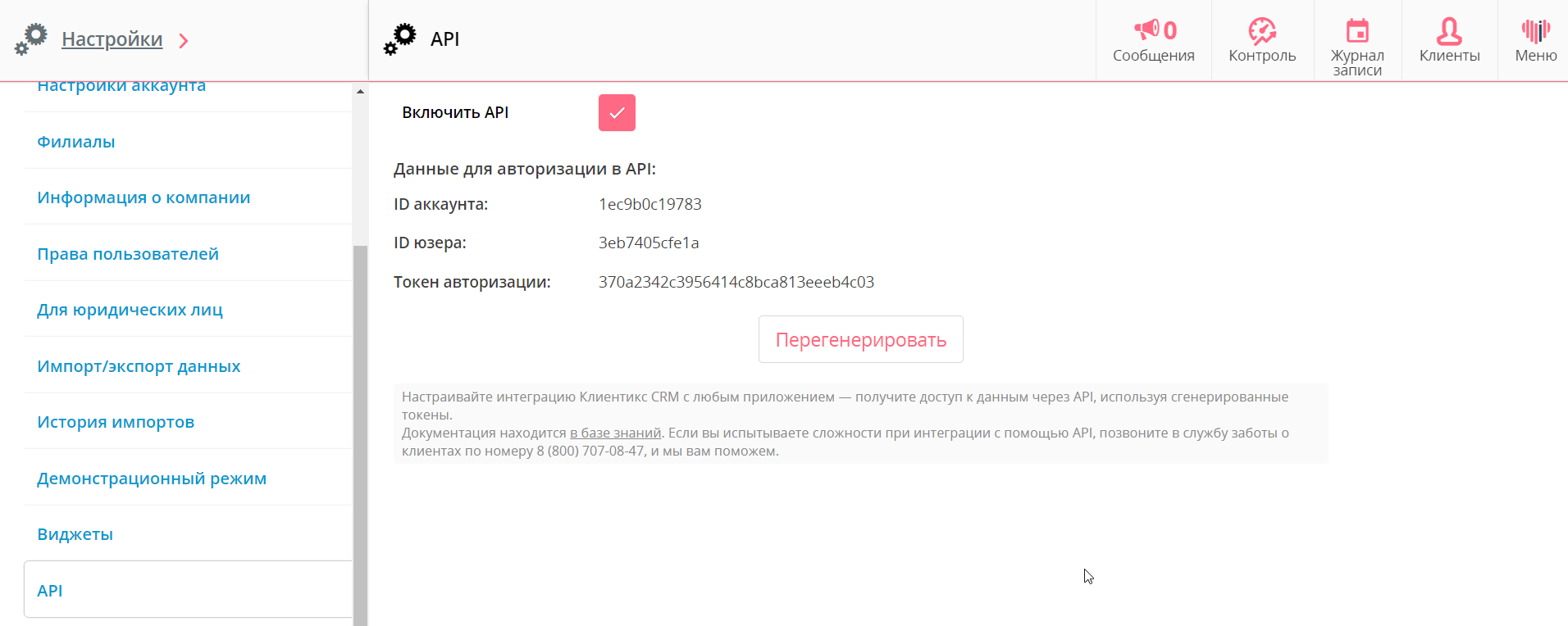 1. В интерфейсе своей Клиентикс CRM перейдите в «Меню» – «Настройки». В списке слева найдите раздел API и зайдите в него. Выберите «Включить API».