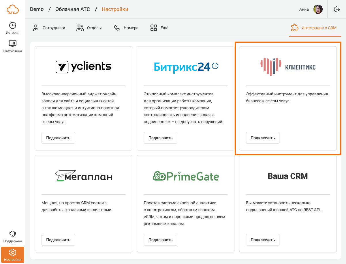 2. В Облачной АТС зайдите в «Настройки» – «Интеграция с CRM» – «Клиентикс». Нажмите «Подключить».