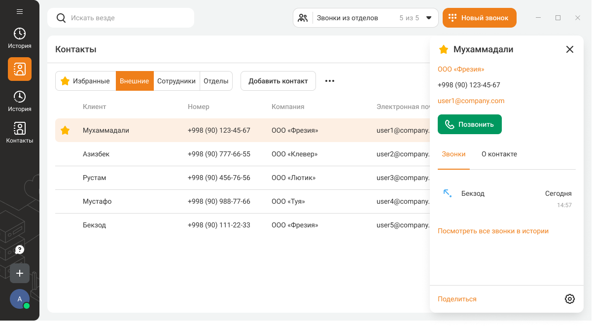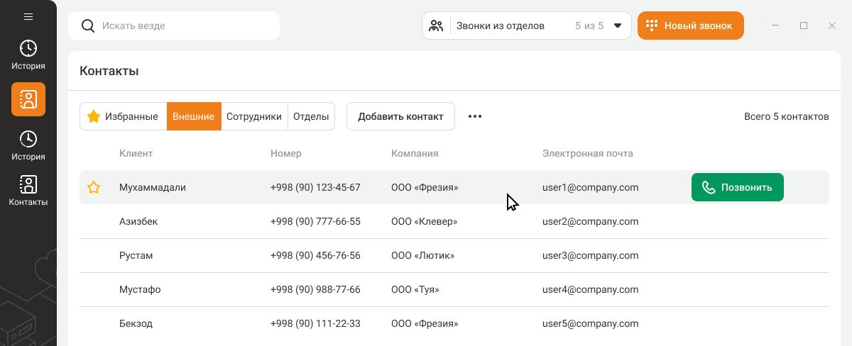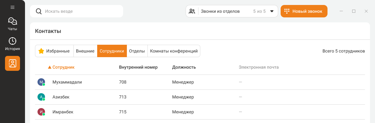 В Корпоративном мессенджере отображаются контакты клиентов и сотрудников. При регистрации сотрудника в АТС его контакт автоматически появляется у всех коллег. Контакты клиентов можно добавлять в мессенджер напрямую, они также доступны всем сотрудникам и синхронизируются с АТС.