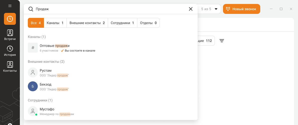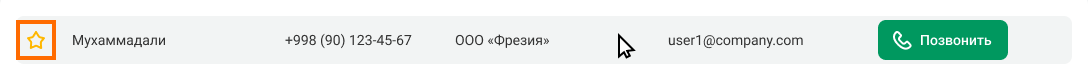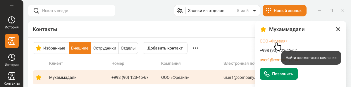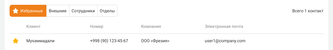 Чтобы найти нужный контакт, в поисковой строке начните писать значение одного из полей: имя, номер, e-mail контакта или название компании.