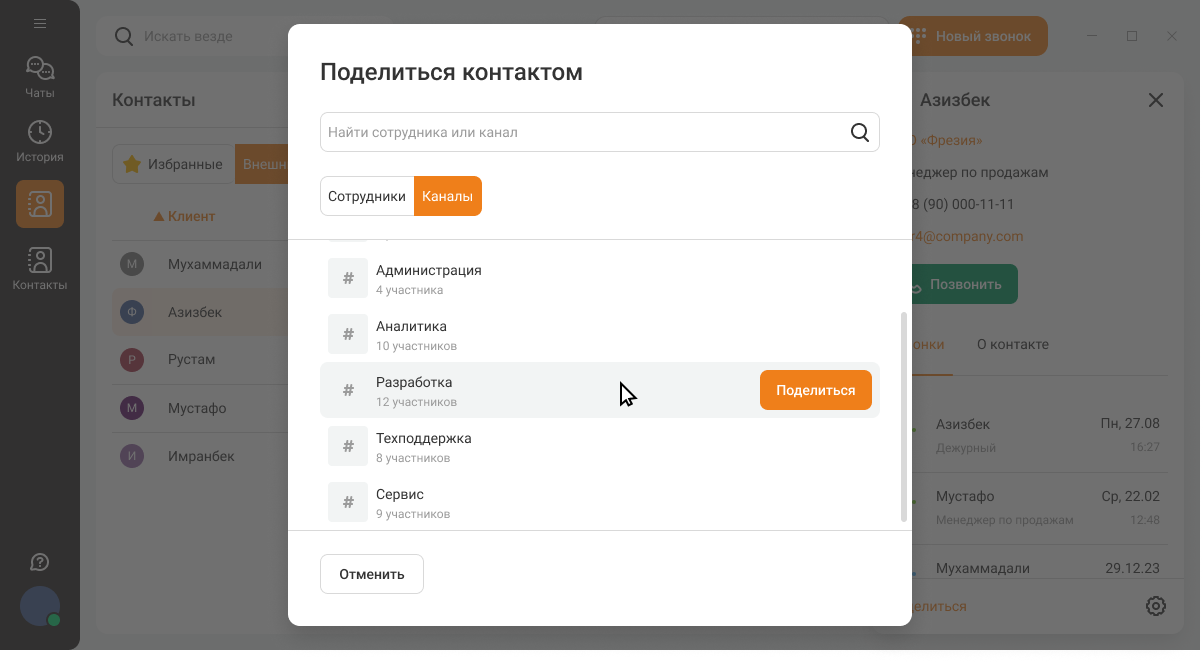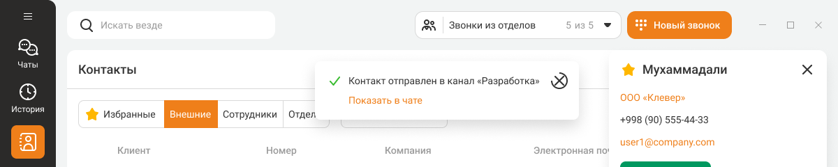 • Поделиться контактом в чате — в чате отобразится краткая карточка контакта с кнопками вызова и отправки сообщения (если это внутренний контакт).