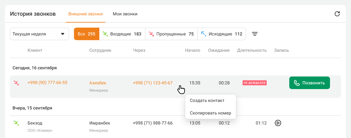 После заполнения данных о клиенте нажмите «Сохранить». Все звонки сохраненного контакта будут автоматически проименованы — его имя будет отображаться в истории.