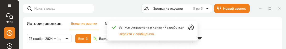 На иконке истории в боковом меню отображается общее число пропущенных звонков, как личных, так и по вашему отделу.