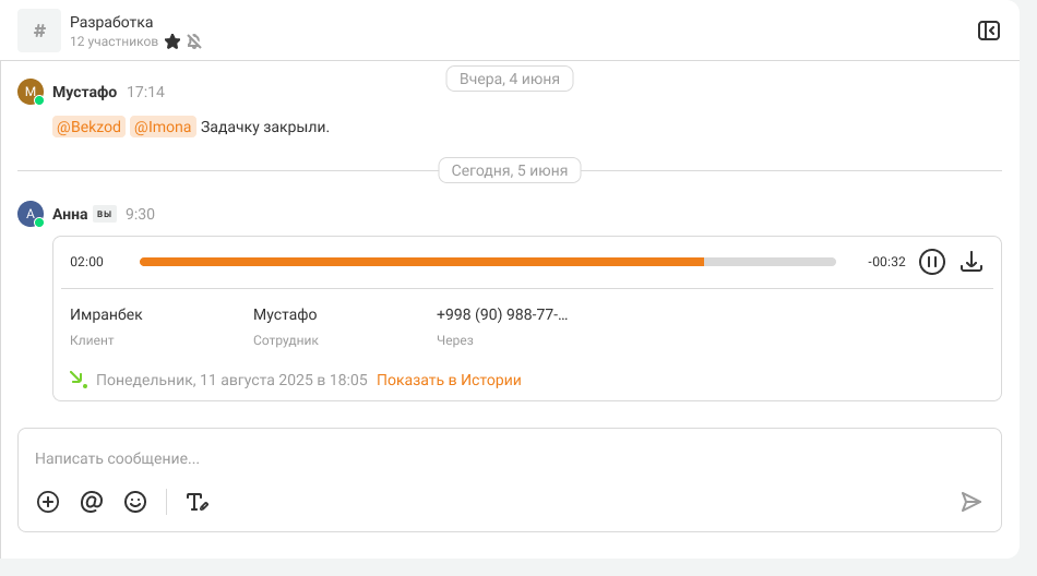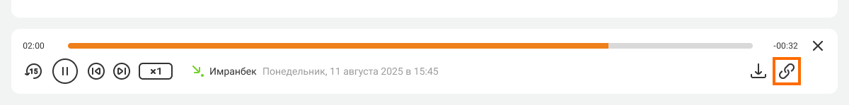 Чтобы поделиться записью звонка в чате, в проигрывателе нажмите на иконку ссылки в правом нижнем углу.