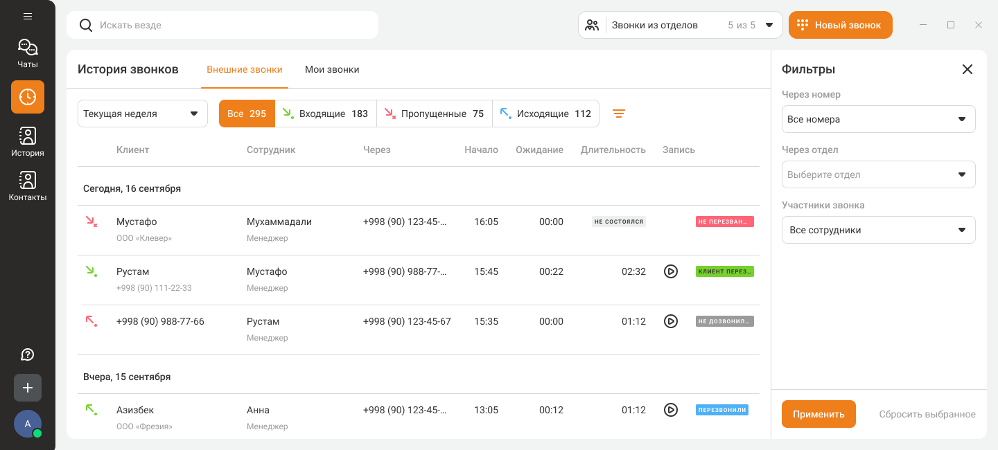- фильтровать звонки по номерам, отделам, сотрудникам, клиентам и типам вызовов за нужный период;