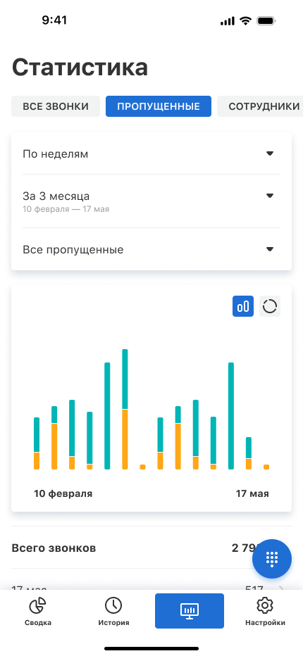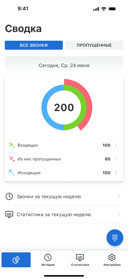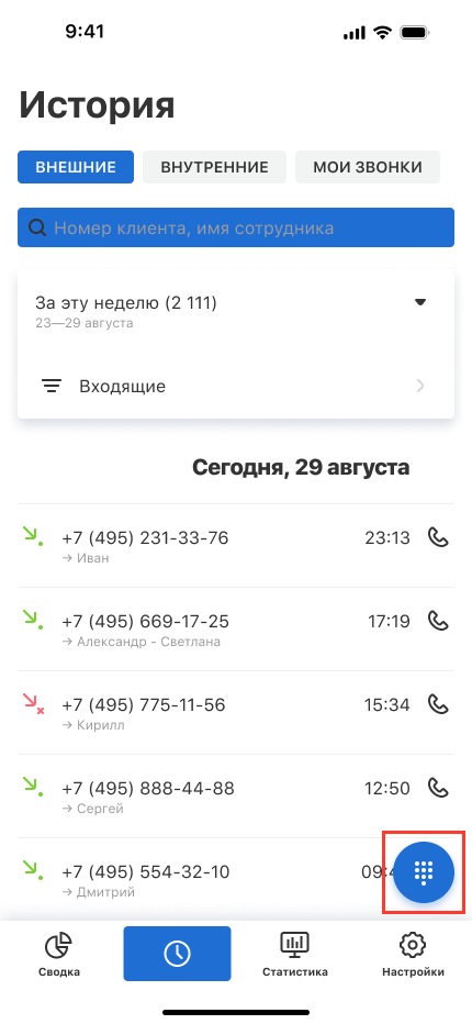 Чтобы начать звонить и принимать звонки, воспользуйтесь круглой кнопкой в правом нижнем углу. Она появляется в разделах «Сводка», «История», «Статистика».