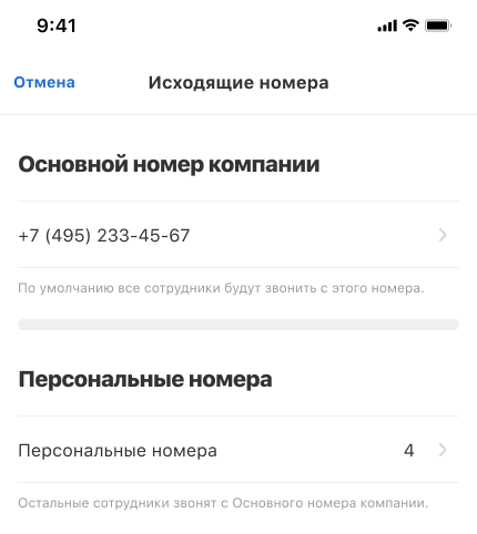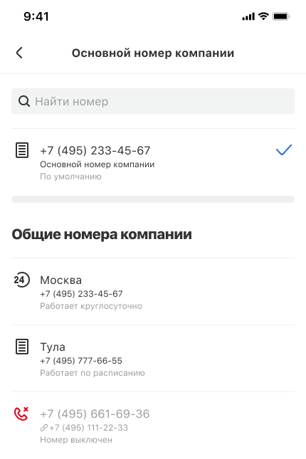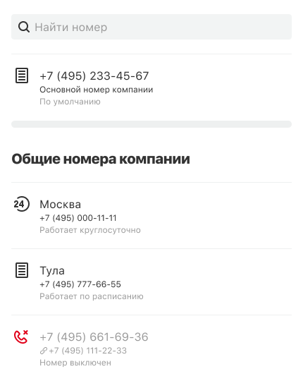 - Общего номера компании — с него будут звонить сотрудники и отделы, у которых нет персональных или региональных номеров.