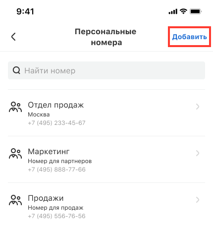 Откроется список настроенных персональных номеров. Нажмите «Добавить», чтобы выбрать персональный номер для сотрудника или отдела.