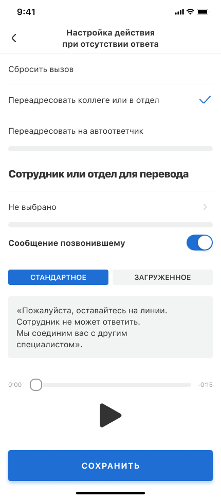 - Переадресовать на автоответчик — чтобы прямые звонки сотрудникам не оставались без ответа, можно переадресовать их на автоответчик.
