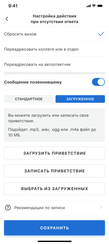По умолчанию АТС озвучит клиенту стандартное уведомление об отсутствии менеджера и о том, что ему ответит другой специалист. Но вы можете загрузить или создать собственное уведомление, в котором, например, расскажете, куда именно будет перенаправлен звонок. Это подготовит клиента к тому, что ему ответит не тот сотрудник, с которым он планировал поговорить. Чтобы создать свое сообщение, нажмите на «Загруженное». Вы можете: