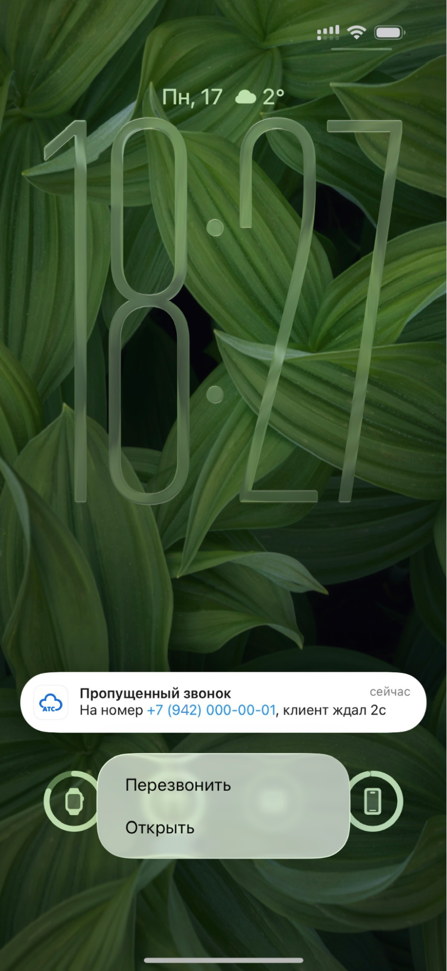 - Для iOS долгое нажатие на push-уведомление вызывает всплывающее меню. Чтобы начать звонок, выберите «Перезвонить». Пункт «Открыть» открывает карточку звонка.