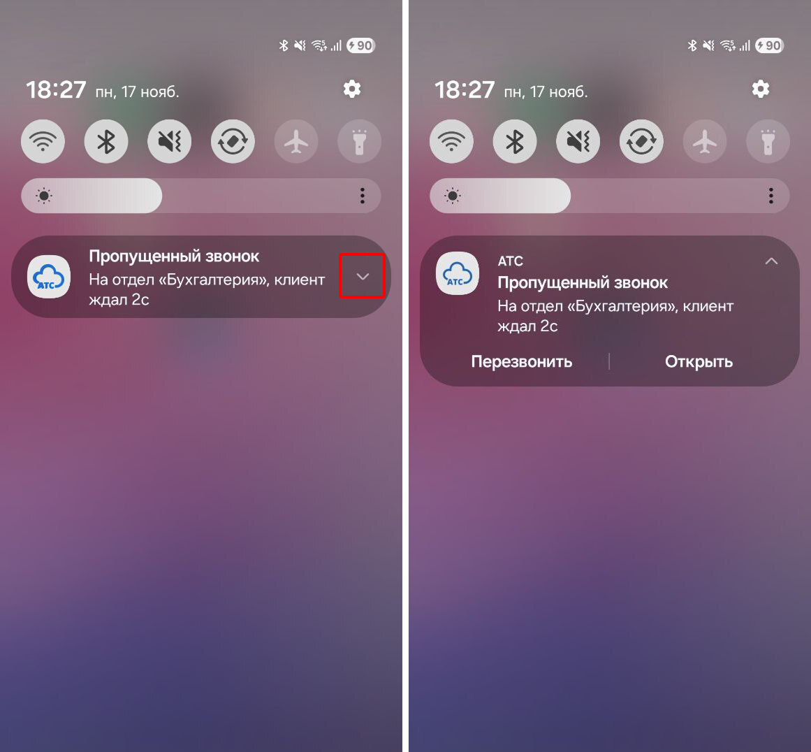 - Для Android нажмите на стрелочку в правой части уведомления. Чтобы мгновенно начать звонок, выберите «Перезвонить». Пункт «Открыть» открывает карточку звонка.