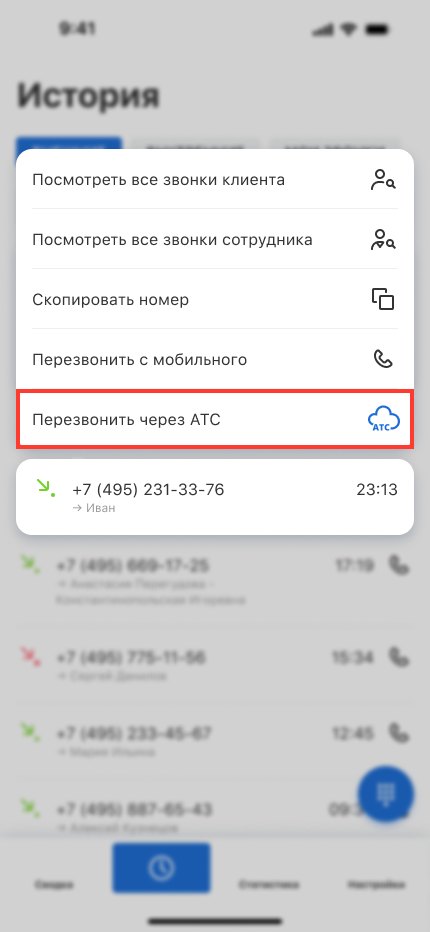 В открывшемся меню выберите «Перезвонить через АТС».