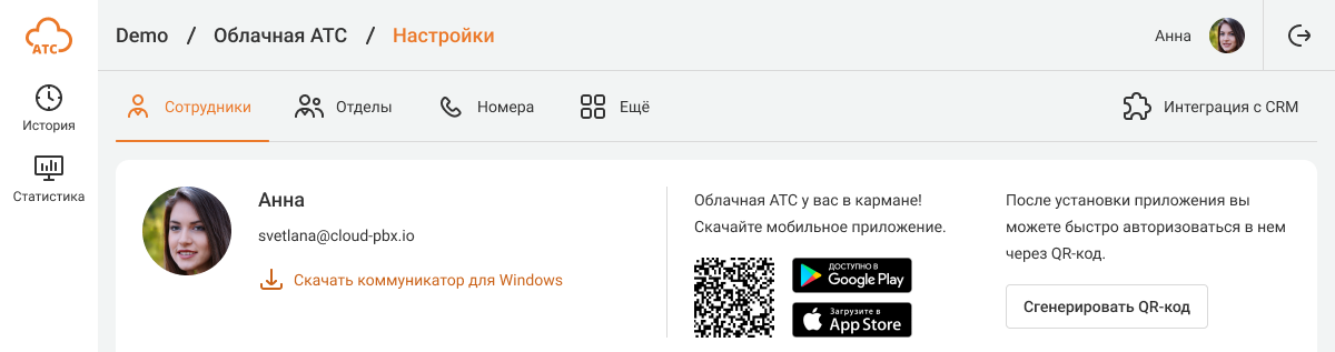 Также можно быстро авторизоваться в мобильном приложении по QR-коду. Для этого в настройках вашего профиля АТС кликните на кнопку «Сгенерировать QR-код» вверху страницы.