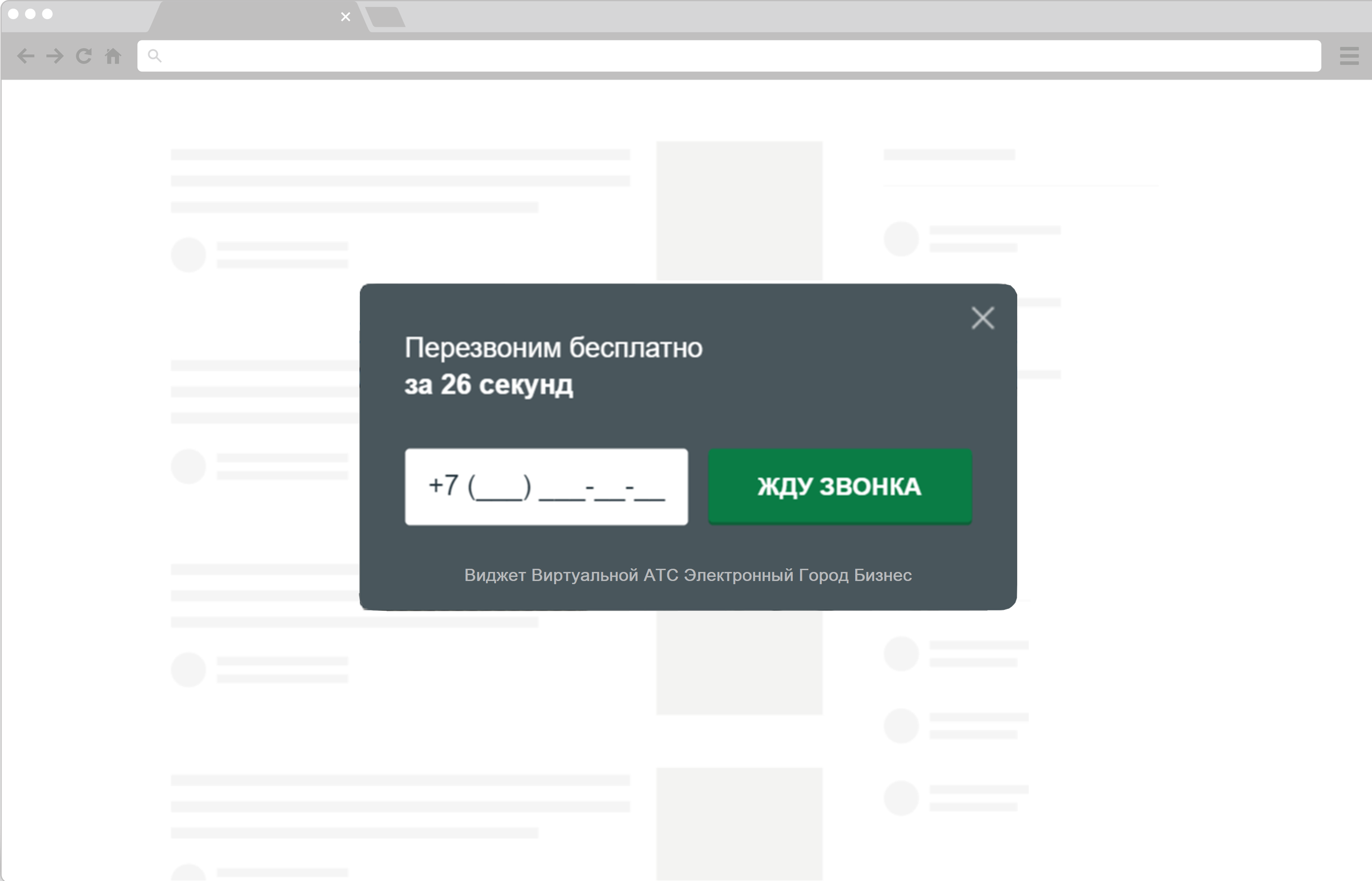 1. Появляется окно заказа звонка, которое сообщает клиенту, что ваш сотрудник перезвонит ему бесплатно в течение 26 секунд. От клиента требуется минимум усилий – правильно ввести свой номер телефона.