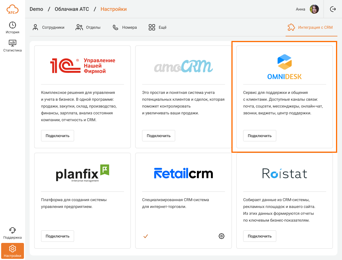 Теперь зайдите в настройки вашей Облачной АТС, в раздел «Интеграции с CRM». Нажмите на интеграцию с Omnidesk.