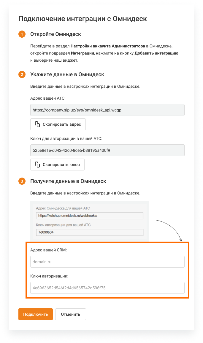 Там вы увидите адрес Омнидеска для вашей АТС и ключ авторизации. Скопируйте эти данные.