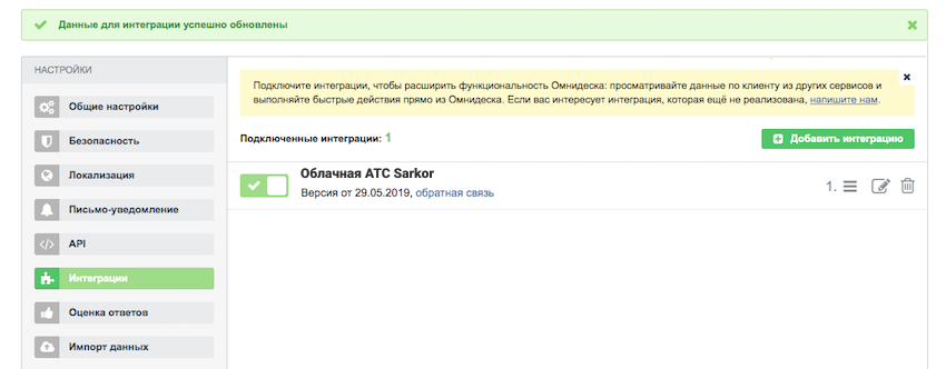 В настройках Омнидеск нажмите Сохранить изменения. Интеграция включена и работает.