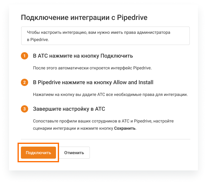 Чтобы настроить интеграцию, вам нужно иметь права администратора в Pipedrive.