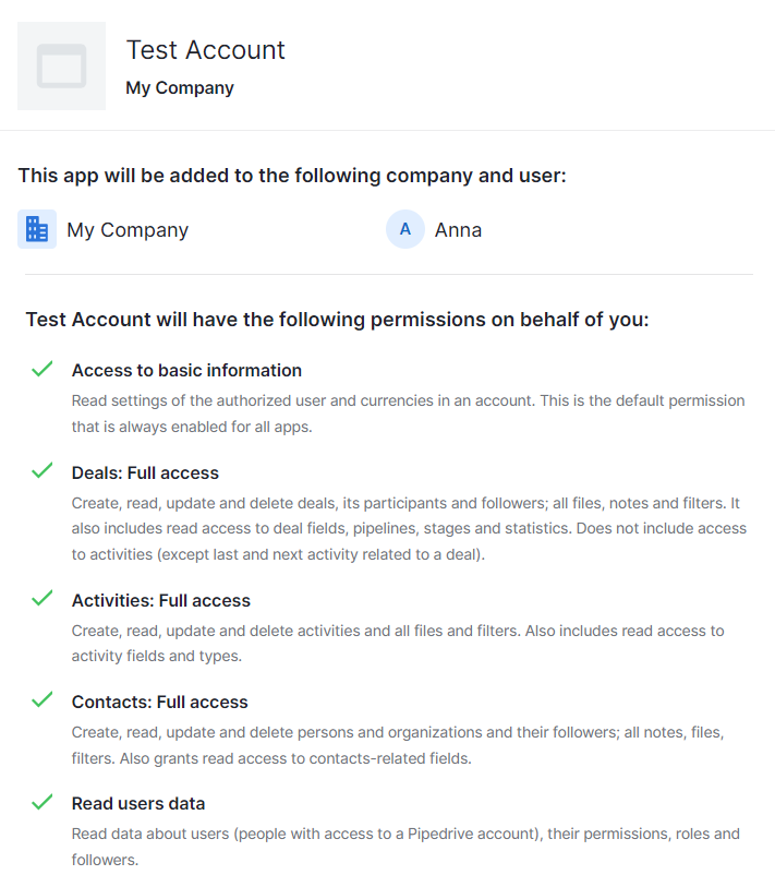 4. Откроется список разрешений, необходимых для работы интеграции. АТС запрашивает доступ к базовой информации об авторизованных в Pipedrive пользователях, сделкам, активностям, контактам, лидам, администрированию аккаунта, возможности прослушивать записи звонков, информации о правах пользователей и т.д.