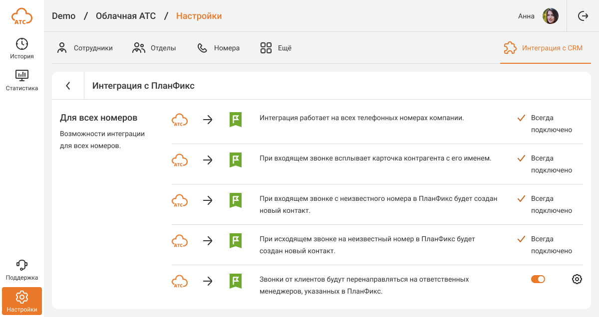 Если вы хотите, чтобы при звонке на номер вашей компании клиент не терял времени на первой линии или IVR и сразу соединялся со своим персональным менеджером, включите данную опцию в настройке интеграции в интерфейсе Облачной АТС.