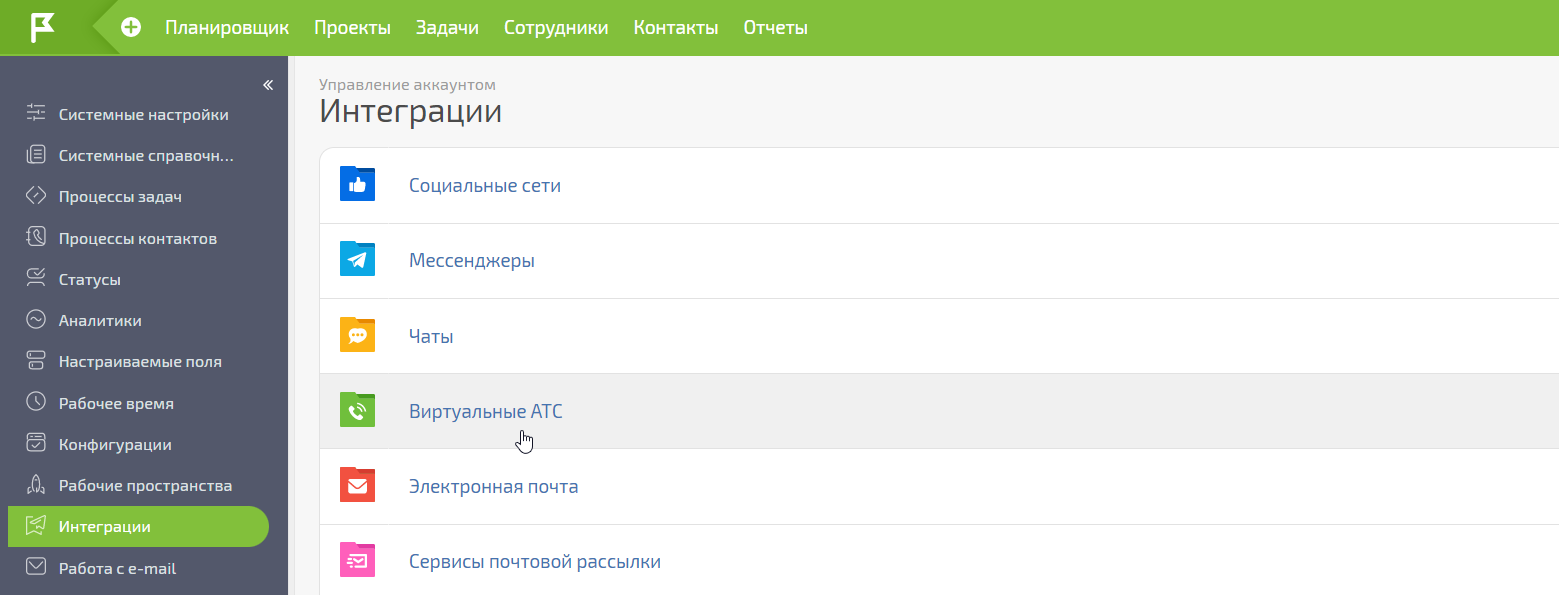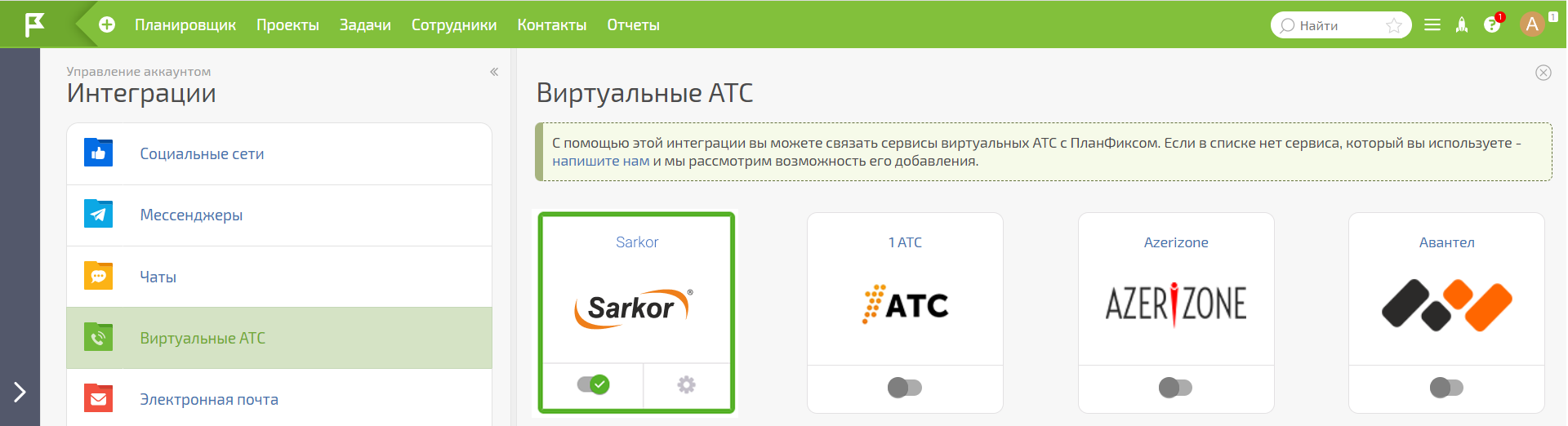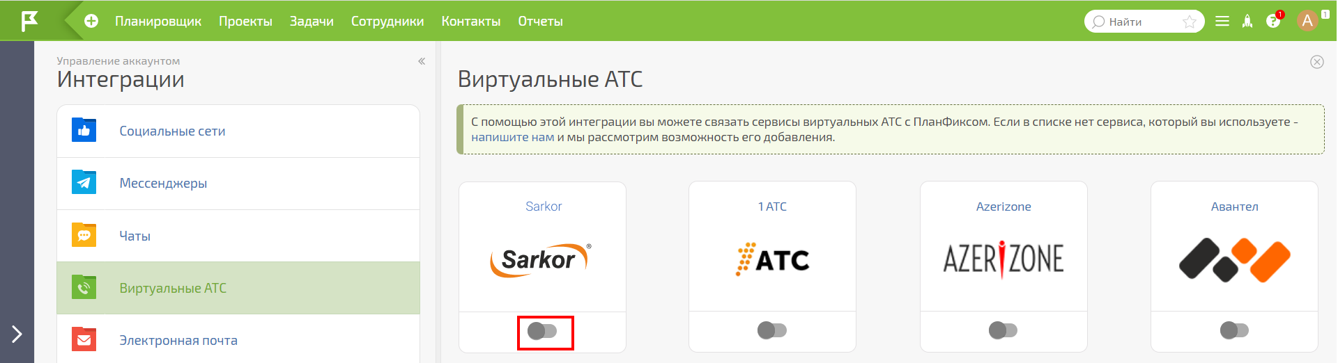 Выберите раздел «Интеграция с другими сервисами» — «Облачные АТС».