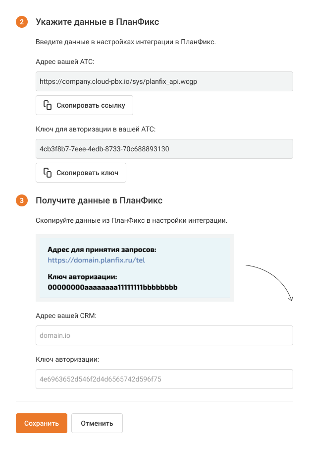 Скопируйте адрес вашей АТС, вставьте его в поле «Адрес АТС» в ПланФикс. То же самое для ключа авторизации: скопируйте его в ПланФикс и вставьте в настройках интеграции.