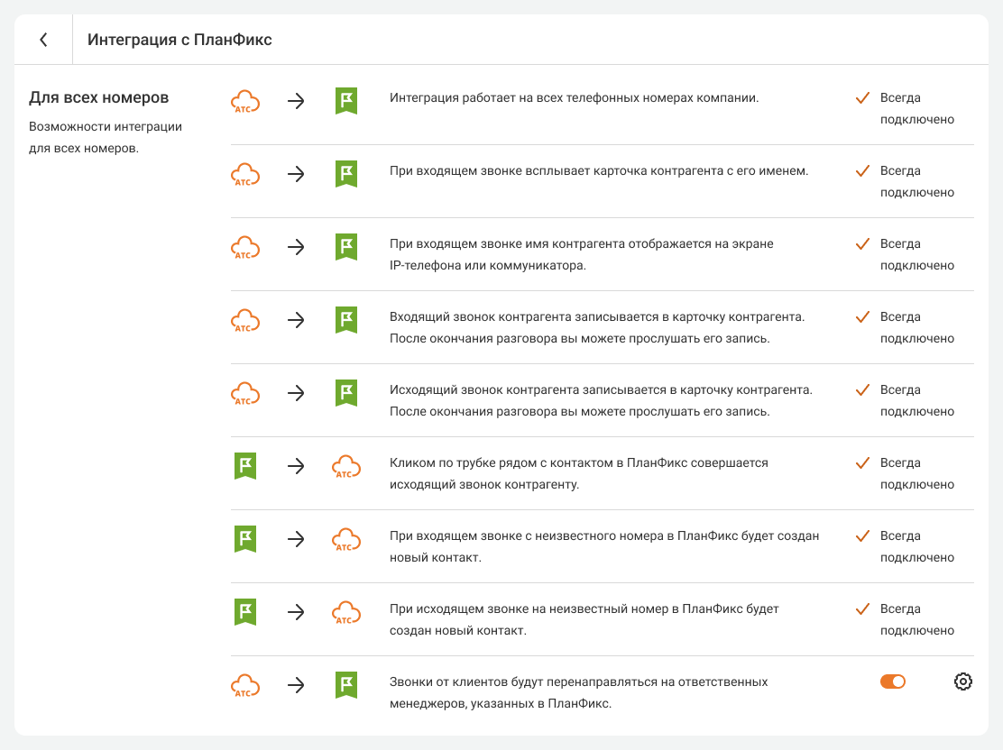 После этого вы попадете на страницу завершения настройки интеграции, где сможете прочитать описание возможностей интеграции и завершить ее настройки со стороны Облачной АТС: подключить или не подключать автоматическое перенаправление звонков на ответственного менеджера.