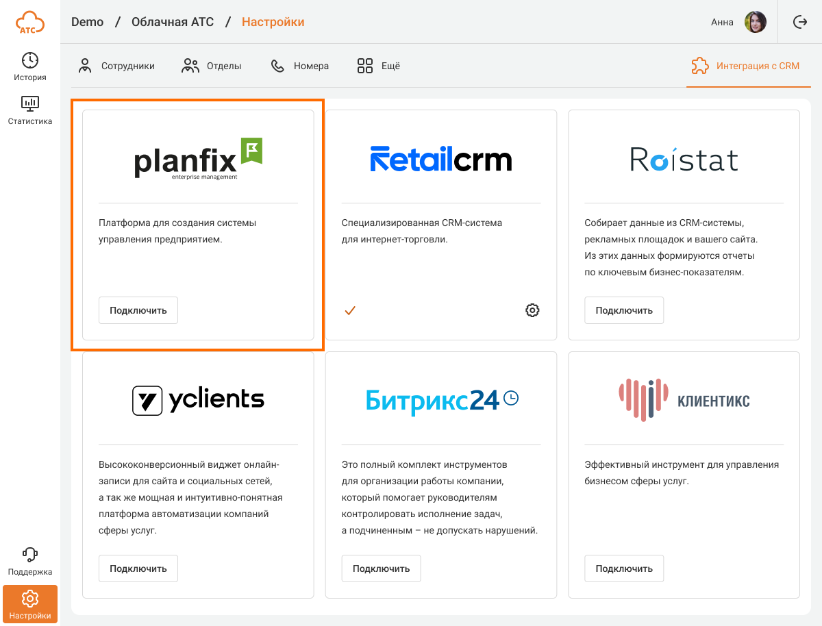 Скопируйте токен телефонии и перейдите в ВАТС. В разделе «Настройки» в правом верхнем углу выберите «Интеграция с CRM». В списке CRM-систем найдите ПланФикс и нажмите «Подключить».