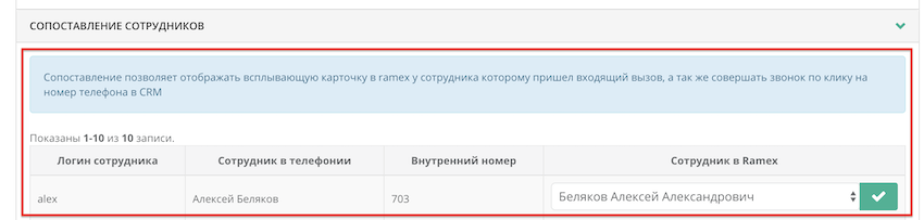 7. Необходимо сделать привязку пользователей Облачной АТС к пользователям Ramex. Для этого в селекторе “Сотрудник в Ramex“ выберите из списка необходимого сотрудника и нажмите на зеленую кнопку подтверждения.