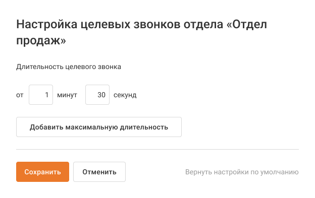 По умолчанию целевыми считаются звонки длительностью от 1 мин. 30 сек. Чтобы это изменить, нажмите на кнопку «Настроить целевые звонки».