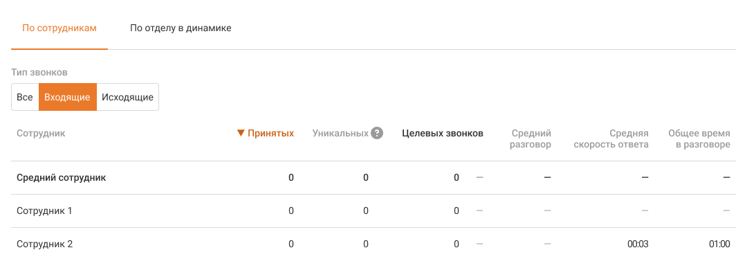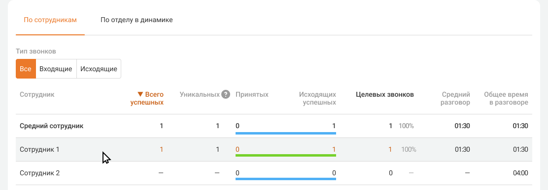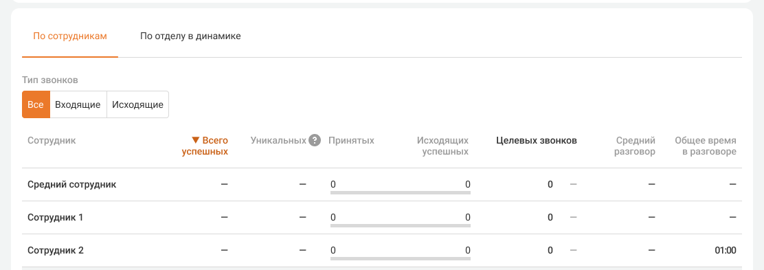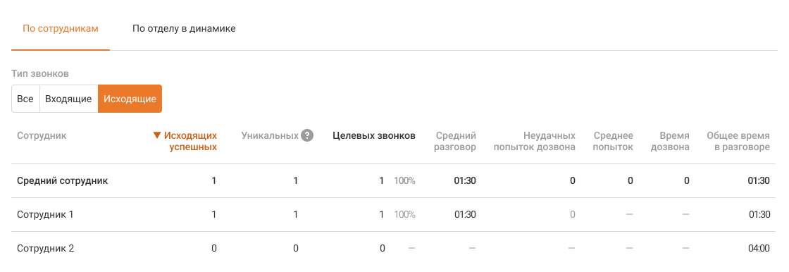 Средний сотрудник. Показатели в этой строке считаются как среднее арифметическое по сотрудникам, у которых есть хотя бы один успешный звонок за выбранный период.
