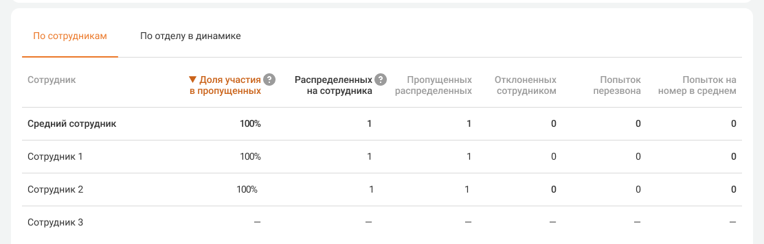 • Средний сотрудник. Показатели в этой строке считаются как среднее арифметическое по сотрудникам, у которых есть хотя бы один пропущенный звонок за выбранный период.