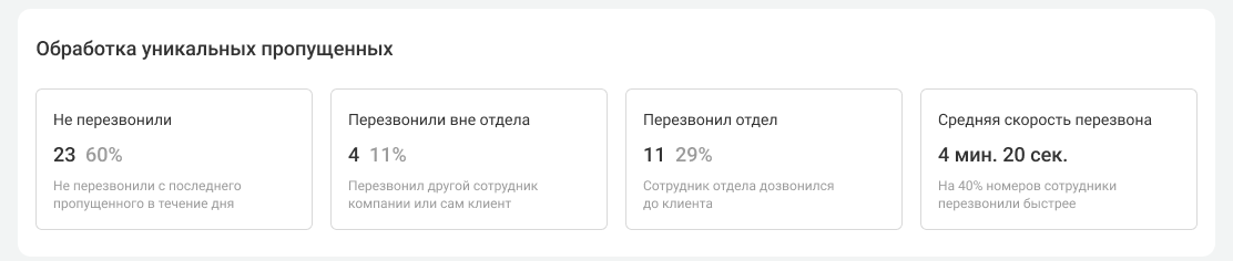 - Перезвонил отдел— какую долю клиентов с пропущенными звонками обработали сотрудники вашего отдела;