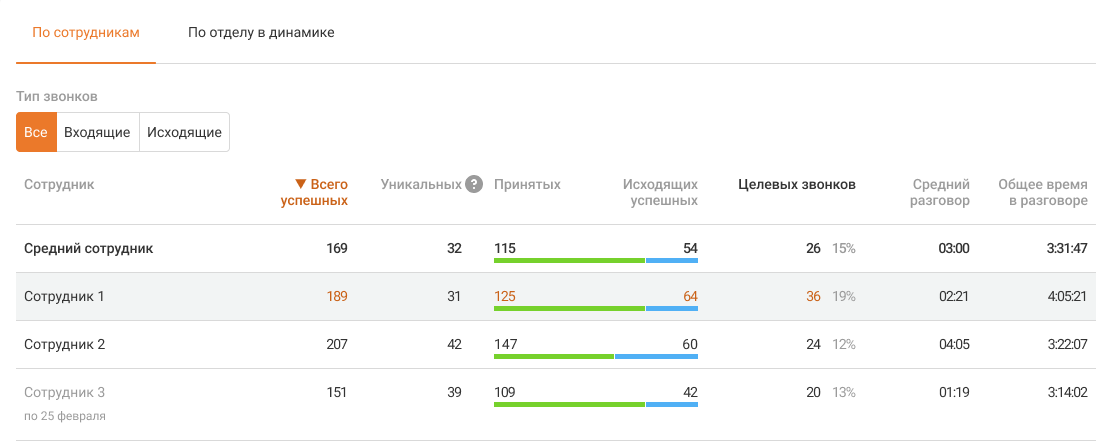 Для оценки вклада каждого сотрудника в результаты отдела используйте таблицу по звонкам сотрудников: по всем вызовам или отдельно по входящим и исходящим.