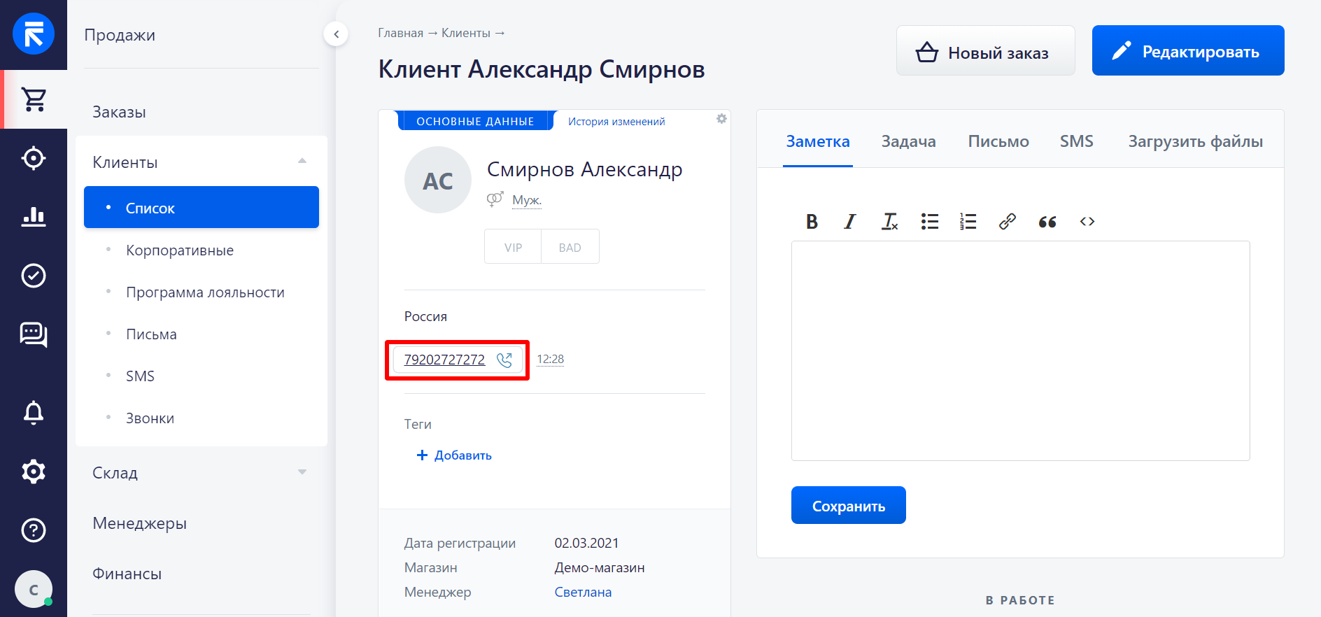 Также позвонить в один клик можно из карточки клиента, нажав на его номер телефона.