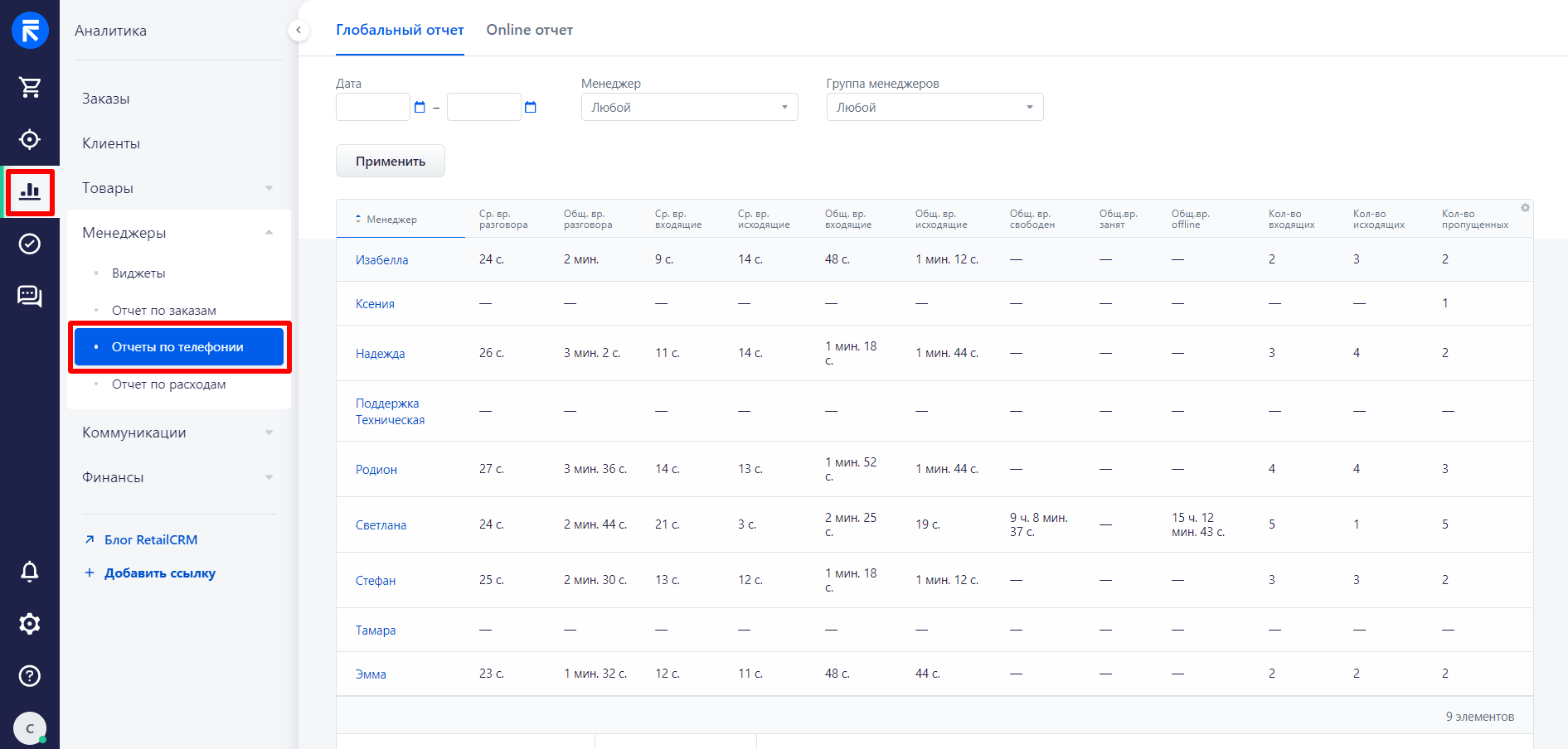 Вы можете посмотреть, как работают со звонками все менеджеры. Для этого на панели инструментов слева найдите блок «Аналитика», откройте пункт меню «Менеджеры» и выберите «Отчеты по телефонии».
