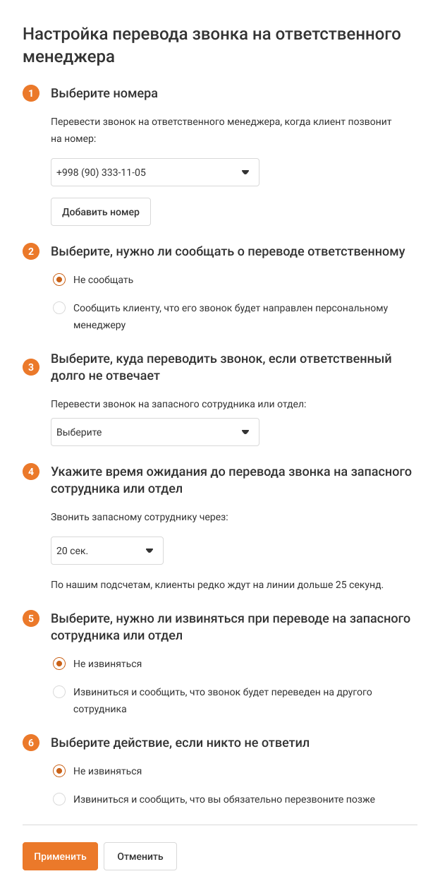 Если ваша компания использует несколько номеров, вы можете настроить сценарии работы в RetailCRM для всех номеров сразу или для каждого в отдельности. Как настроить подобные сценарии интеграции читайте в статье.