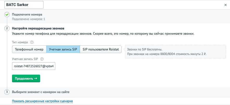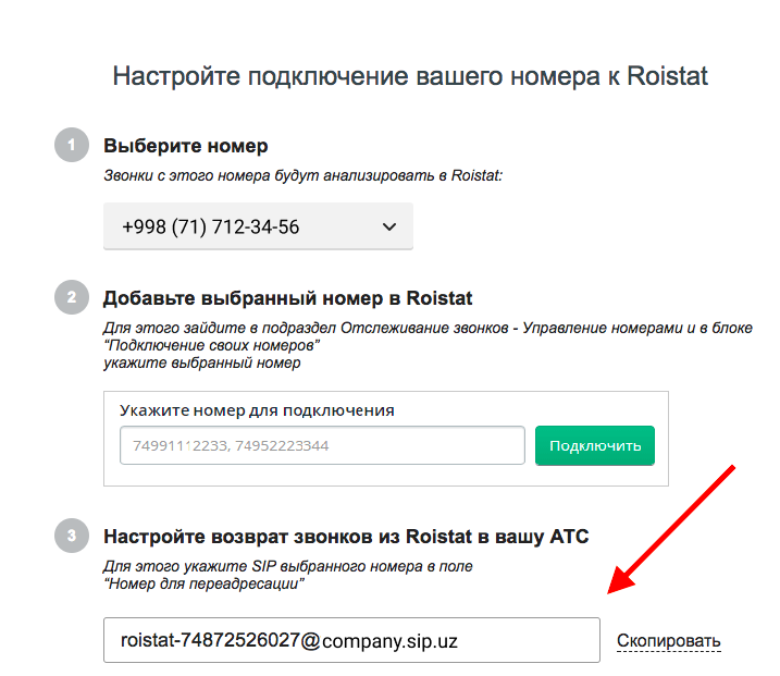 3. Выберите номер, звонки на который вы будете анализировать в Roistat. Затем из пункта 3 скопируйте специальный SIP-адрес.