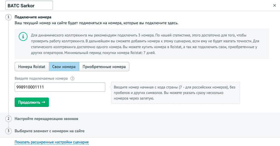 Готово! Теперь все звонки на номер будут отправляться в Roistat для анализа. Оставшиеся номера вы можете добавить точно таким же образом.