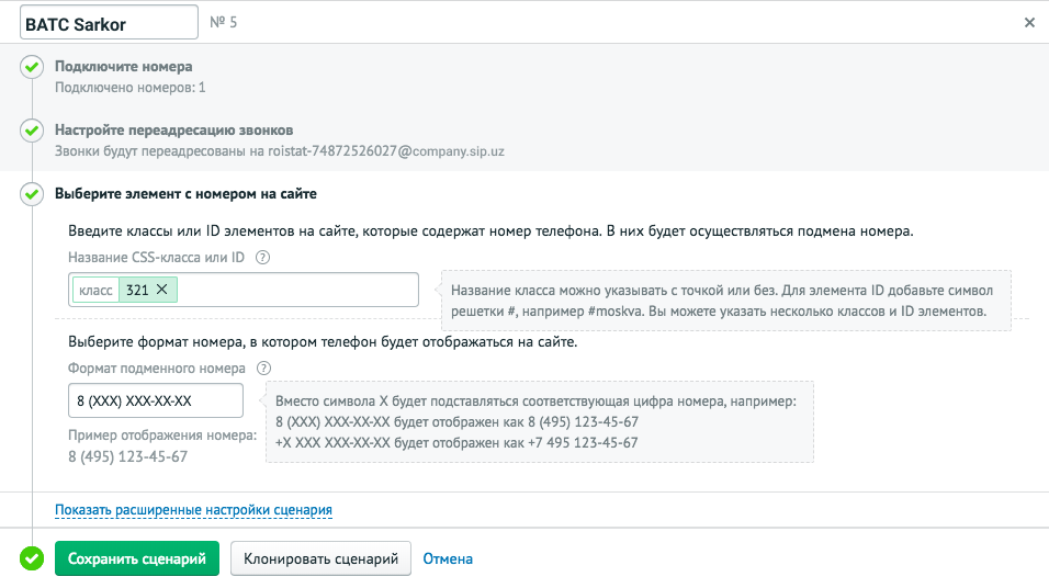 5. Создайте новый сценарий, укажите его имя, в «Подключите номера» зайдите во вкладку «Свои номера» и введите туда ваш номер.