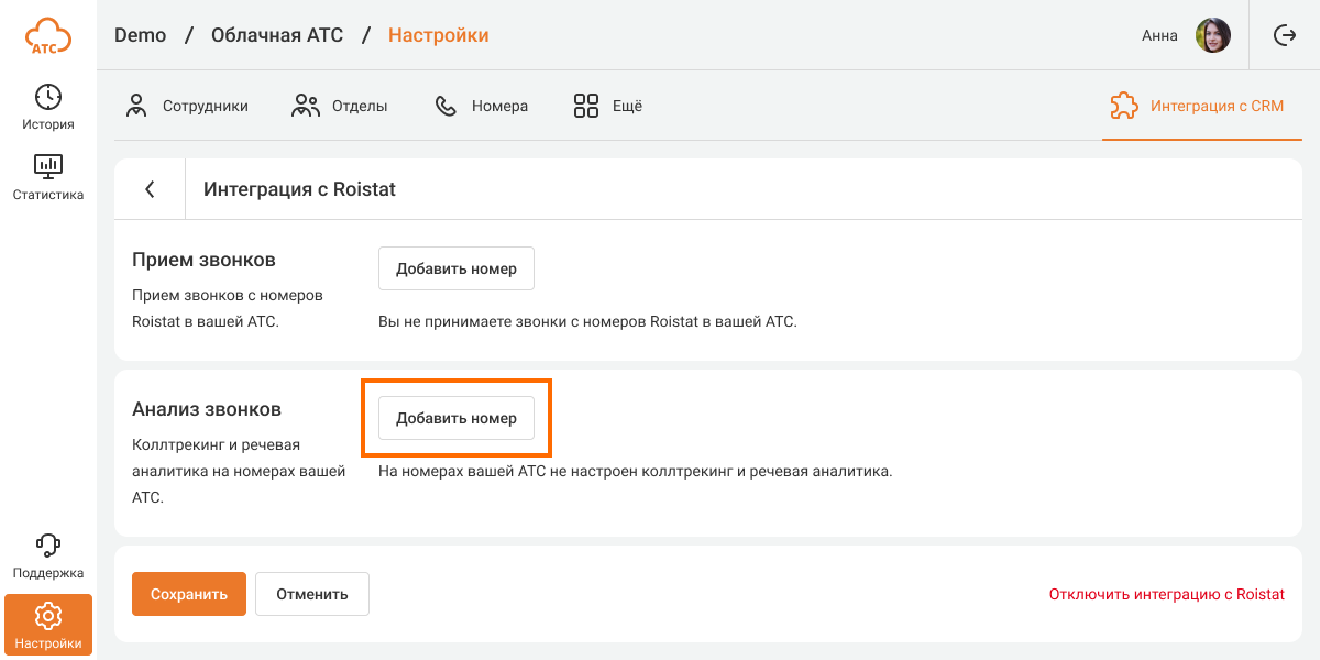 2. В разделе «Анализ звонков на номера вашей Облачной АТС с помощью Roistat» нажмите «Добавить».