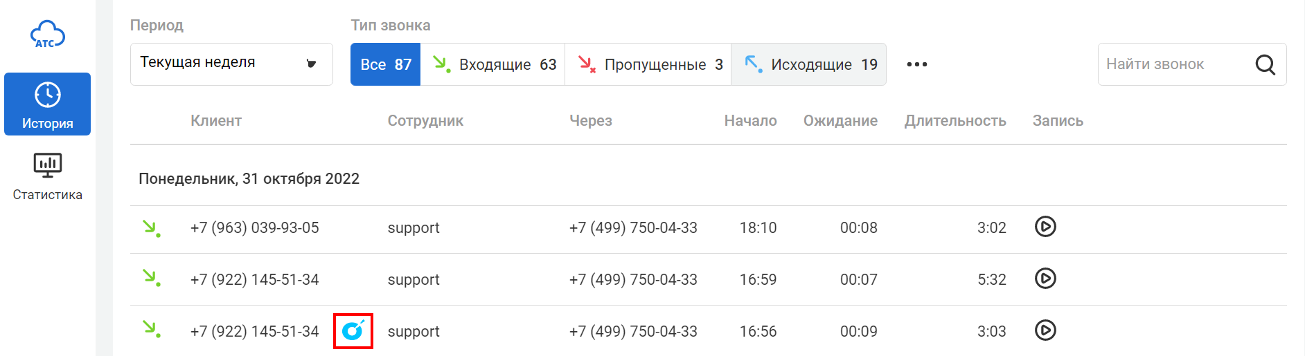 11. Готово! Теперь звонки со всех номеров Roistat, настроенных в сценарии, будут переадресованы в Облачную АТС. В разделе «История» звонки, поступившие из Roistat, будут помечены специальным символом.