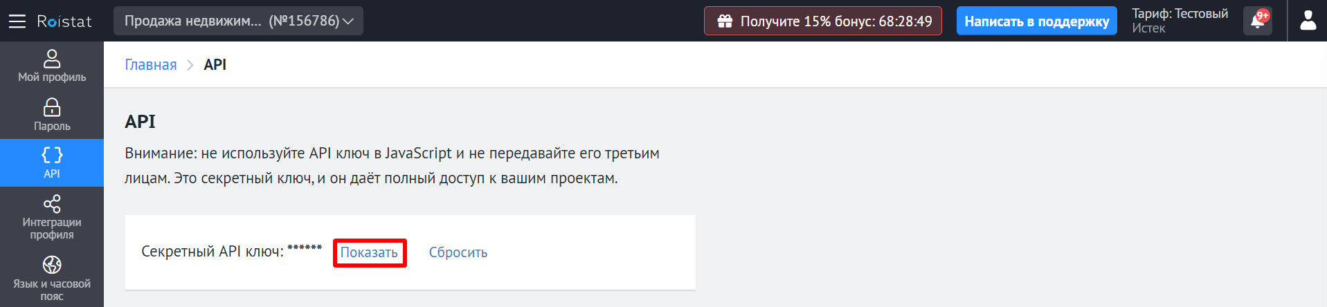 2. В новой вкладке браузера зайдите в ваш аккаунт Roistat, откройте Профиль и перейдите в раздел API.